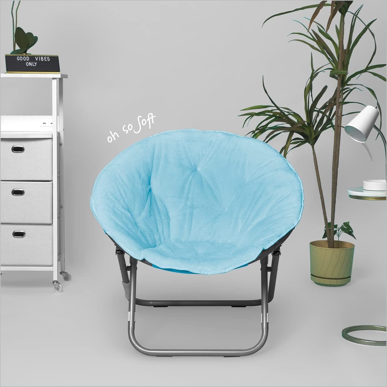 • DESIGN: Settle into a seat that loves you back and is designed to fit your body. A saucer chair designed in a gorgeous light blue color that will suit any room décor. Featuring a silver sturdy metal frame to compliment its look. Add additional seating to living rooms, bedrooms, rec rooms or any room with this saucer chair. Designed in a simple bold color that will add a pop of color to any room you decide to put it in. Add a fun and cozy touch to any room you desire with this super soft faux fur saucer chair!