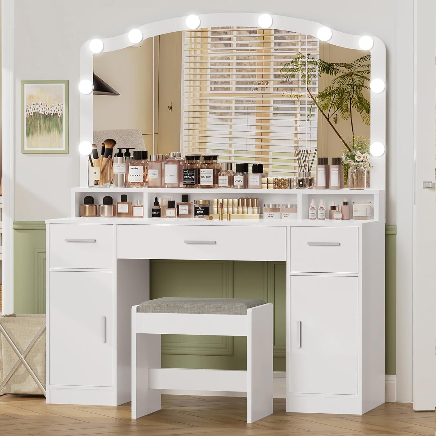 - 💄【10 Hollywood Light Bulbs】Equipped with the 10 built-in light bulbs, vanity set provides super-bright lighting conditions, creating the perfect atmosphere for makeup and hairstyling, perfect for daily makeup routine, selfies and live streaming. It’s a must have for any girly girl room that enjoy doing hair and makeup!
