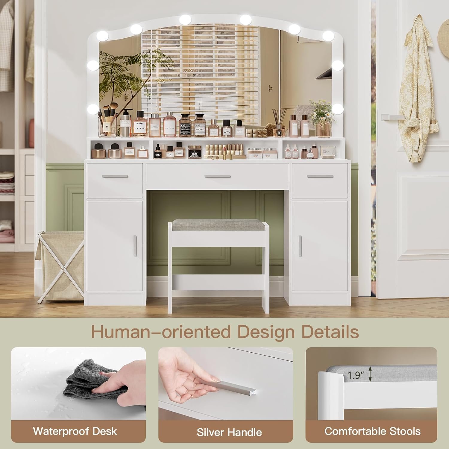 - 💄【Vanity Set with Super Large Mirror】With full size large lighted mirror makeup vanity( Mirror Size: 39.4″L*22.4″W), you will no longer need to move your body from side to side to search for the best makeup angle like in the past! Fine selection of high-definition makeup mirror, easier to view your makeup details, whether prepping for a new day in the early morning or gearing up for a dinner date, you’ll be perfectly perched this vanity with large mirror